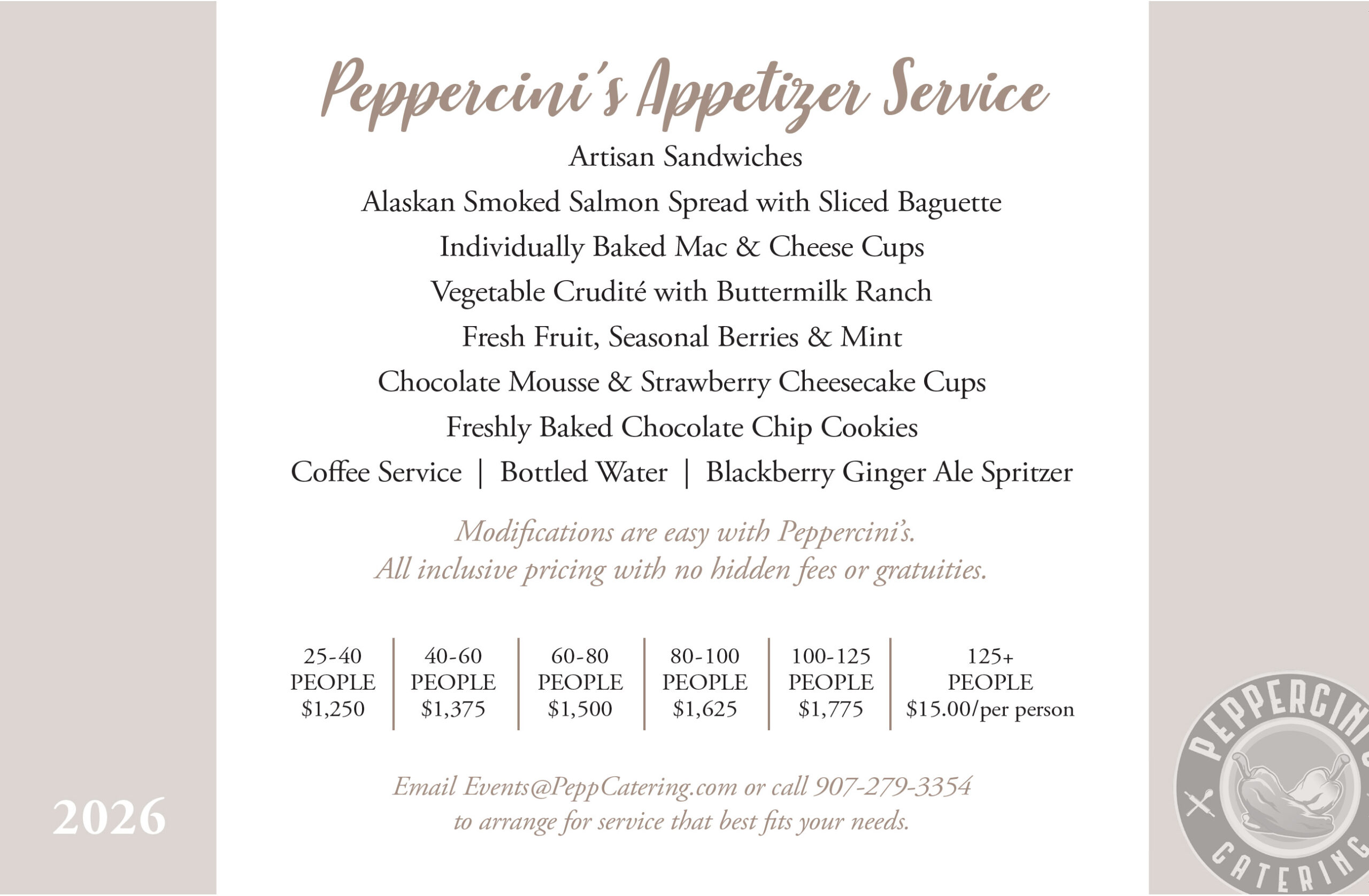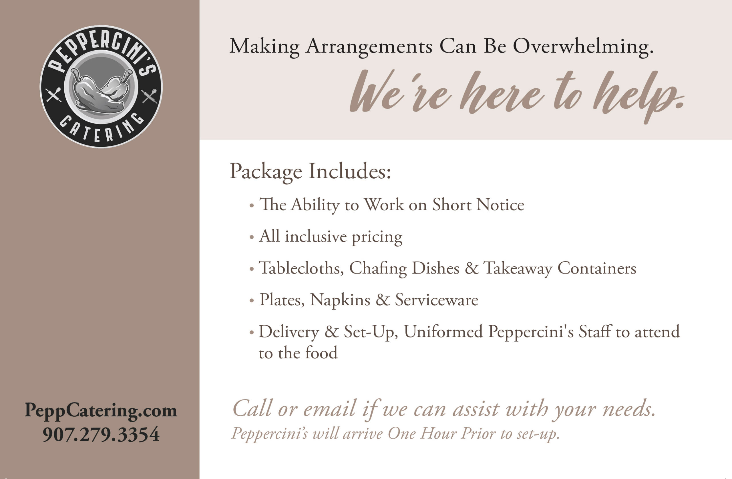 Peppercinis understands that making these types of arrangements at the worst times can be overwhelming for anyone – we have a VERY easy to understand menu that will be perfect for your Funeral, Celebration of Life or Memorial Service.